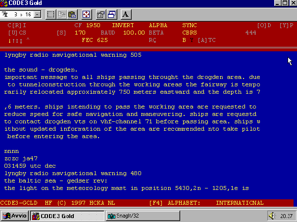 Sistema: Navtex / Sitor B / FEC 625, Velocità 100 Baud, Shift 170 Hz