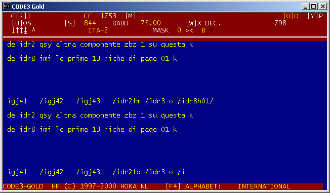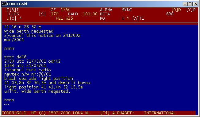 DATE 25-03-2001 TIME 10:21:52 SYSTEM TWINPLEX F1B-1 WORD Interleaved FREQUENCY 18513.000 kHz BAUDRATE 100.000 SHIFT -400 -200 +200 +400 SELCAL tpec decoder Code3 Gold, ricevuto da SMS