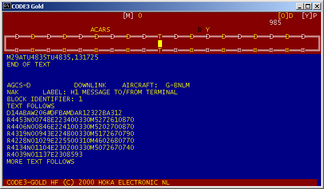 DATE 23-03-2001 TIME 23:28:50 SYSTEM ACARS ch 1 FREQUENCY 131725.000 kHz BAUDRATE 2400.000 SHIFT 340 Hz decoder Code3 Gold, ricevuto da SMS Testo