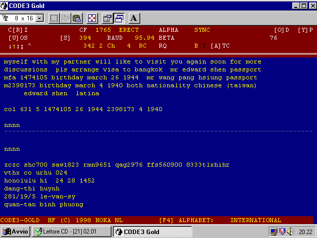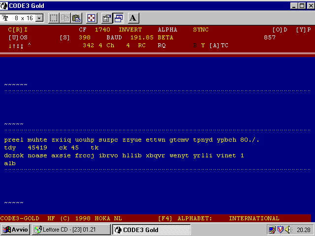 ARQ Sincrono Duplex. Utilizza 7 bit per la correzione dell'errore, e l'alfabeto ITA 3, secondo le norme CCIR 342-2 consiste in uno due o quattro canali in Time Division Multiplex TDM. Utilizzato da due stazioni su frequenze diverse per consentire le operazioni in full duplex. All'inizio del ciclo il primo carattere di tutti i canali è invertito: 1 canale: canale A eretto 2 canali: canale A eretto, canale B invertito, caratteri interleave 4 canali: canale A eretto, canale B invertito, canale C invertito, canale D eretto Canali A e B caratteri con interleave, A/B e C/D bit con interleave. Il ciclo di ripetizione è di 4, e 8 caratteri. Velocità tipica 96 e 200 Baud, shift 400 Hz. CCIR 342-2 (aka TDM 342 / ARQM-2, ARQM-4 / ARQ28 / ARQ56) Synchronous Duplex ARQ, 7 bit ITA 3 alphabet to CCIR Recommendation 342-2. One, two or four channels in TDM (time division multiplex). Two stations on different frequencies, working as ISS (transmitting) and IRS (receiving) station. At start of cycle first character of all channels are inverted; 1 channel: A-channel erect. 2 channel: A-channel erect, B-channel inverted, character interleaved. 4 channel: A-channel erect, B-channel inverted, C-channel inverted, D-channel erect, Channels A and B character interleaved, A/B and C/D bit interleaved. Marked cycle of 4 or 8 characters. ![]() ![]() |