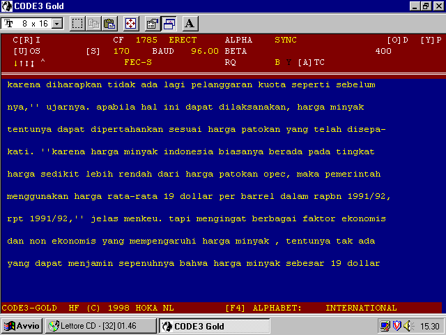 ARQ Simplex. Utilizza l'alfabeto ITA 3, 7 bit, e i caratteri sono interlacciati, ogni blocco di 15 caratteri è invertito, e viene ripetuto dopo 1050 msec. Usato da due o più stazioni sulla stessa frequenza utilizzando il modo di trasmissione FEC Forward Error Correction. In ciclo di IDLE, BETA si trova sia in posizione DX che RX. In condizione di IDLE può essere scambiato per il sistema CCIR 242. Velocità tipica 96 Baud, shift 170 Hz FEC-S / FEC1000S Simplex ARQ , ITA 3 alphabet, 7 bit, character interleaved; each block of 15 characters is inverted and repeated after 1050 msec. Two or more stations on the same frequency, transmitting mode in FEC (Forward Error Correction). Idle: Beta in Rx and DX position. During these idle conditions, it is identical to CCIR 242 idle pattern! ![]() |