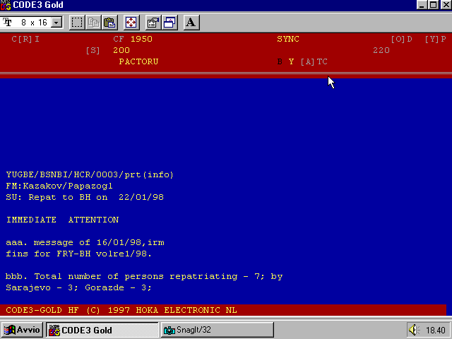 Il sistema Pactor è stato sviluppato inizialmente dai radioamatori, e consiste in un pacchetto di dati sincroni che può essere inviato a seconda della bontà del collegamento a 100 o 200 Baud, e comunque, indipendentemente dalla velocità, la conferma di ricezione è sempre pari a 12 bit. Il ciclo ha una durata di 1,25 Sec e ogni pacchetto ' data block' ha la durata di 960 mS e la conferma di avvenuta ricezione è di 120 mS. Ogni pacchetto consiste in 96 bit se viene utilizzata la velocità di 100 Baud o in 192 a 200 Baud. Ogni blocco di dati con protocollo AX25, è suddiviso in 3 sezioni, intestazione, dati, e un sistema di controllo per il rilevamento dell'errore (CRC). Questo sistema si suddivide in vari modi nella parte inerente il trattamento dati. Tutti sono riconosciuti in modo automatico e vengono mostrati durante la ricezione nella finestra di stato, compreso il sistema di compressione con il protocollo Huffman. Vi sono varie modalità Pactor, le più famose sono: HAM amatoriale, ICRC, UN, IFRC, ecc. ecc. PACTOR Amateur radio system consisting of packets of synchronous data at either 100 or 200 Baud. Data blocks are 960mS long and the acknowledgement 120mS long. Alternates in a 1.25 second cycle. The acknowledgement is always 12 bits long at 100 baud regardless of whether the system data speed is 100 or 200 baud. Each transmitted packet consists of 96 bits at 100 baud and 192 bits at 200 baud. Each data block, as with AX25 packet, contains an address block, status information and a CRC Checksum for error detection. There are various sub-modes to this system including the use of data compression using Huffman coding. ![]() |