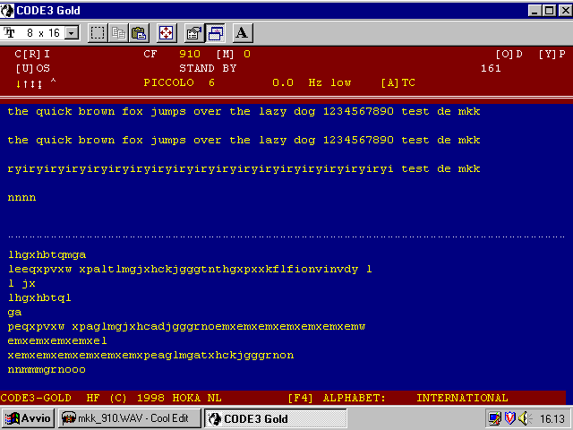 | PICCOLO Mark VI a 6 Toni Sistema sviluppato dal British Foregin and Communications Office che prevede la trasmissione sequenziale di due toni audio, scelti tra i sei o dodici disponibili, per ciascuno dei caratteri da inviare. Lo stato di IDLE si verifica quando la stazione invia alternativamente i toni 5 e 6, ed essendo questi i toni centrali risulta molto semplice sintonizzare correttamente questo sistema quando è in STAND BY. Il sistema PICCOLO più diffuso è quello che utilizza 6 toni, dal 3 all 8, dell'alfabeto ITA-2, mentre è più difficile incontrare il sistema che utilizza l'alfabeto ITA-5 e tutti i 12 toni. In entrambe i casi i toni sono spaziati di 20 Hz e numerati da 0 a 11. Questo sistema di comunicazione è tra i più difficili da decodificare, il punto più critico è sopratutto nella fase di sintonia, dovete fare in modo che il centro frequenza del segnale non differisca più di 3 Hz dal vostro riferimento ed è preferibile impiegare per questo tipo di segnali un ricevitore estremamente stabile con step di sintonia di 1 Hz. PICCOLO Mark VI British Foreign and Commonwealth Office (FCO) designed system based on sending 2 of 6 tones in sequence for ITA-2 and 2 of 12 for ITA-5 for each character to be sent. Idle condition is tones 5 and 6 sent sequentially. These two tones are also the two centre tones thus making tuning easy when the station is in standby. Two user baudrates of 50 and 75 Baud are possible but the on-air speed remains constant due to the use of inserted idlers for 50 Baud. Tones used are No. 3 to 8 at 20 Hz apart for ITA-2 Baudot (Most common) No. 0 to 11 at 20 Hz apart for ITA-5 ASCII (Very rare). Piccolo's usually reside on 510, 910, 1310 and 1710 Hz offsets from a carrier point. Most often in USB. 510 will nealry always be the engineering channel and be idle for long periods of time. The 910 Hz channel is nearly always keying crypto traffic and is referred to as the Data channel.